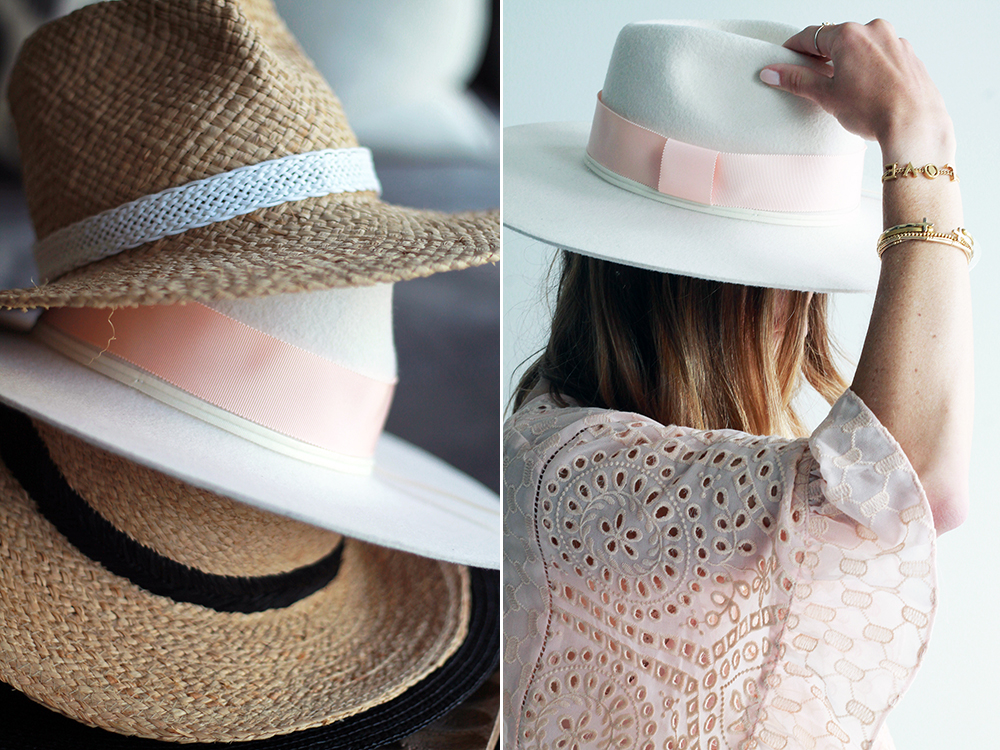 For the next ones I made super easy removable straps with grosgrain ribbon in the most beautiful blush color, and a braided white ribbon for a chic Summer vibe ;) Trust me, anyone can make them. All you need to do is measure your hat's head circumference, cut the material you're using a tiny bit larger (so that you can overlap the ends), and iron on each end, a small piece of velcro (this is what I used). Easy right? I promise it won't take you more than 10 minutes!