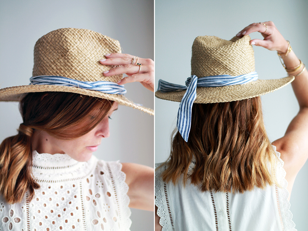 So, how exactly is this done? Well, first you need a hat you love and know what kind of look you want to give it. Since my Summer palette has been all about blush, white, and white and blue stripes, those are the looks I went after. As much as I loved the detail on this hat, I decided that cutting the zig-zag trim would make it more versatile and I'd get more use of it as I kept finding that the brown trim was limiting myself a bit. For the first look I wrapped the belt of a striped jumpsuit I own and voilá! A cute upgrade without having to do much. You can use a handkerchief, a thin fabric belt from a dress, even the straps of a lace-up top! Easy peasy right?